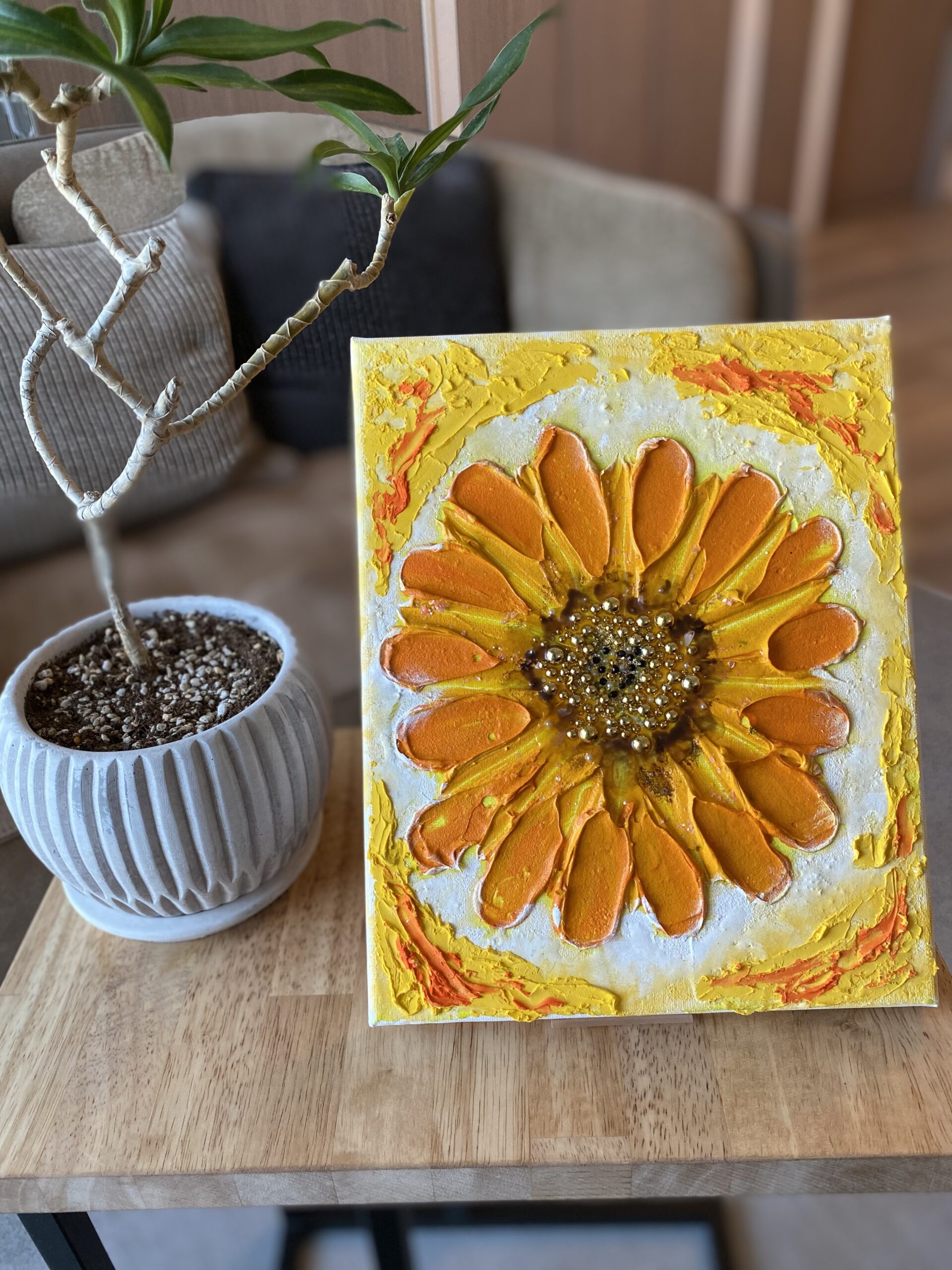 エネルギーを感じる色使いでイエローとオレンジのストロークが動きを作り、まるで太陽の熱を感じるような温かさがあります。