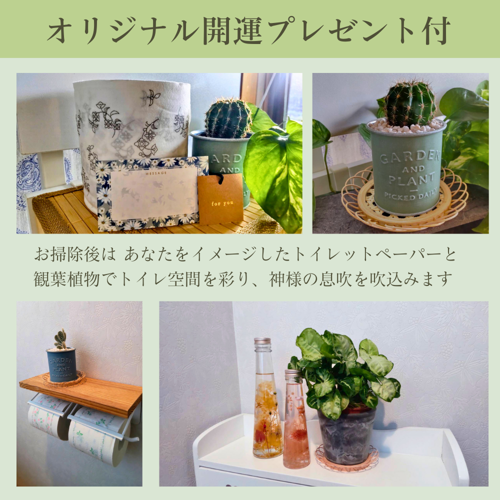お掃除完了後、あなたのエネルギーや好みに合わせてセレクトした「観葉植物」・「トイレットペーパー」をプレゼントいたします。