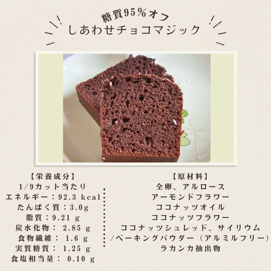 砂糖はラカンカとアルロースに置き換え、糖質は通常のチョコケーキより約95%オフ。