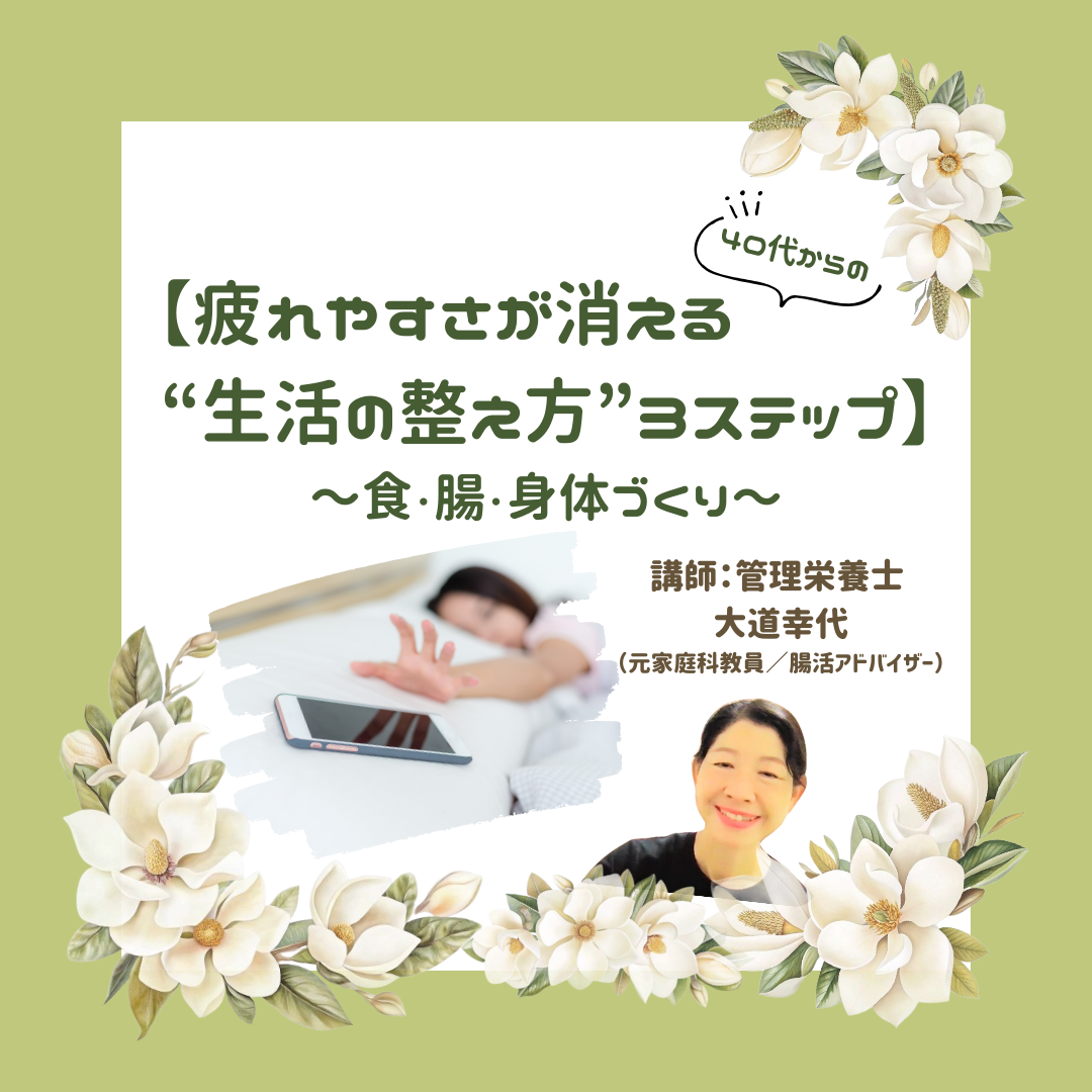 この講座は、体も心も疲れやすくなる40代以降の女性のために、「生活の整え方」を具体的かつシンプルに伝える1回完結型のレッスンです。