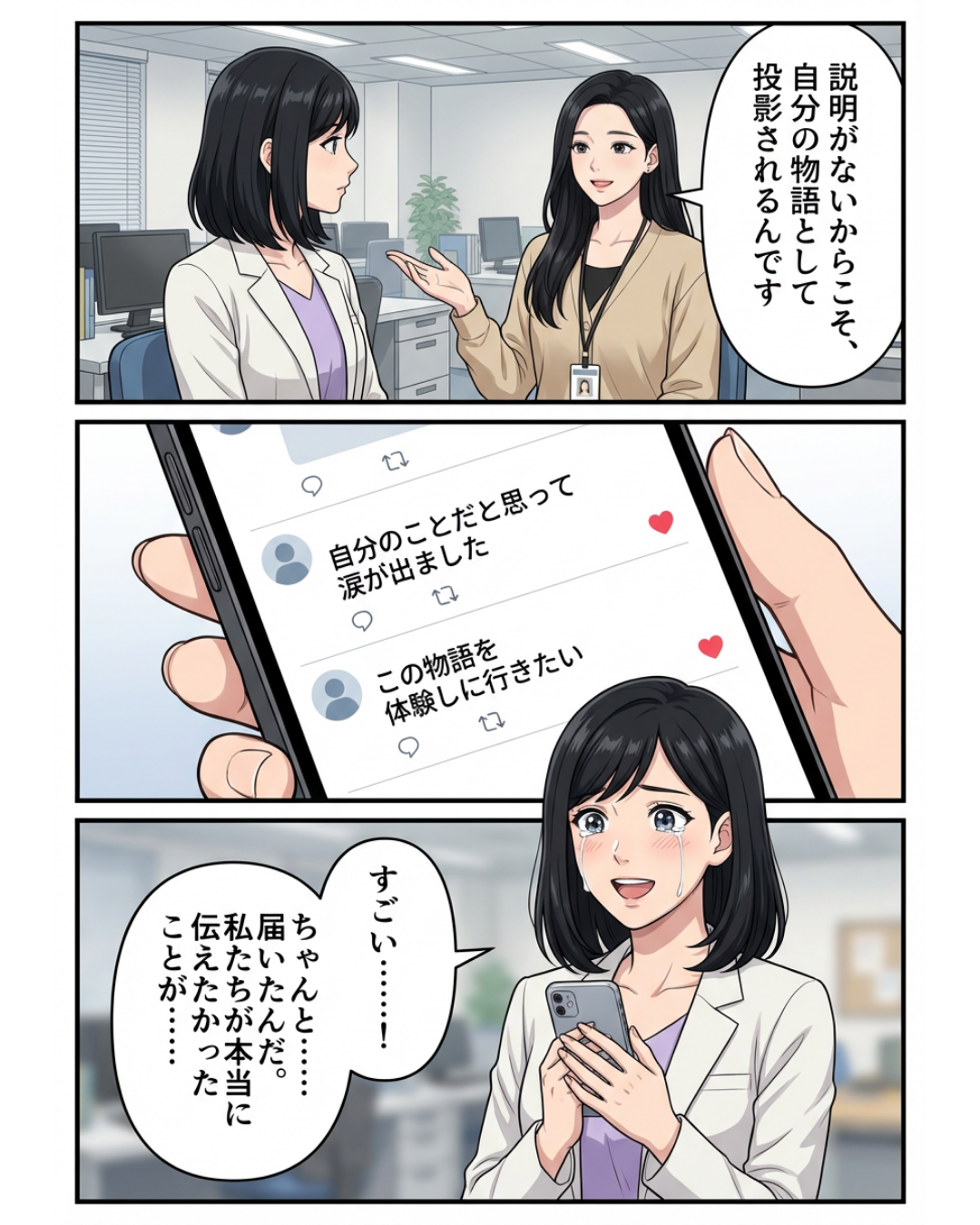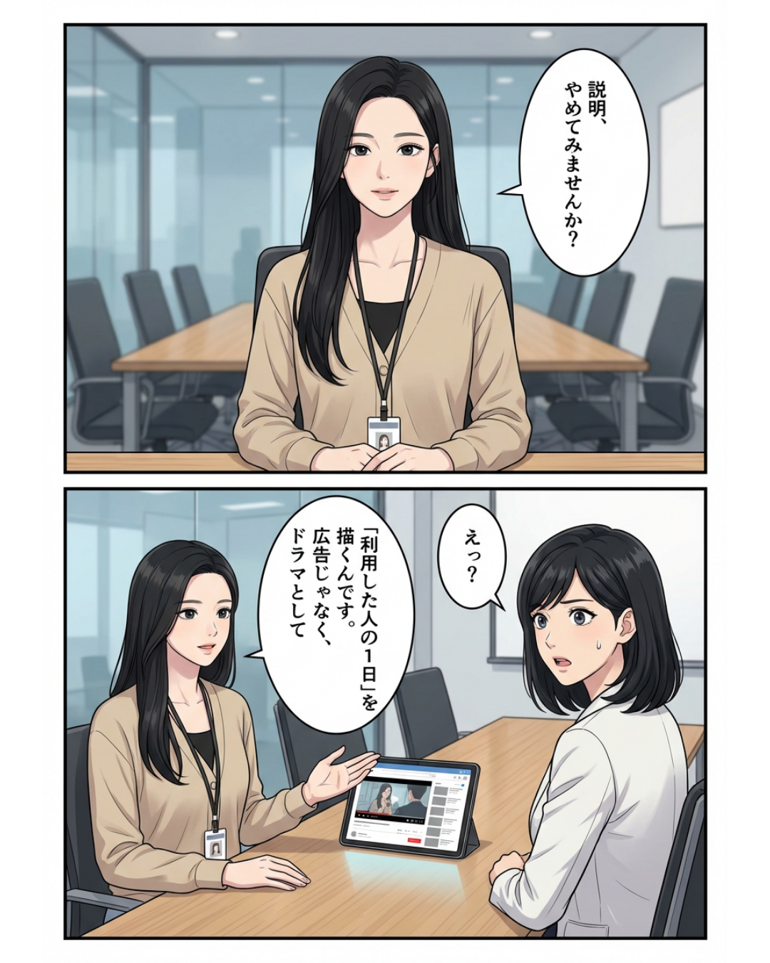 会話形式のAIマンガになることで直感的に理解してもらえるようになります。