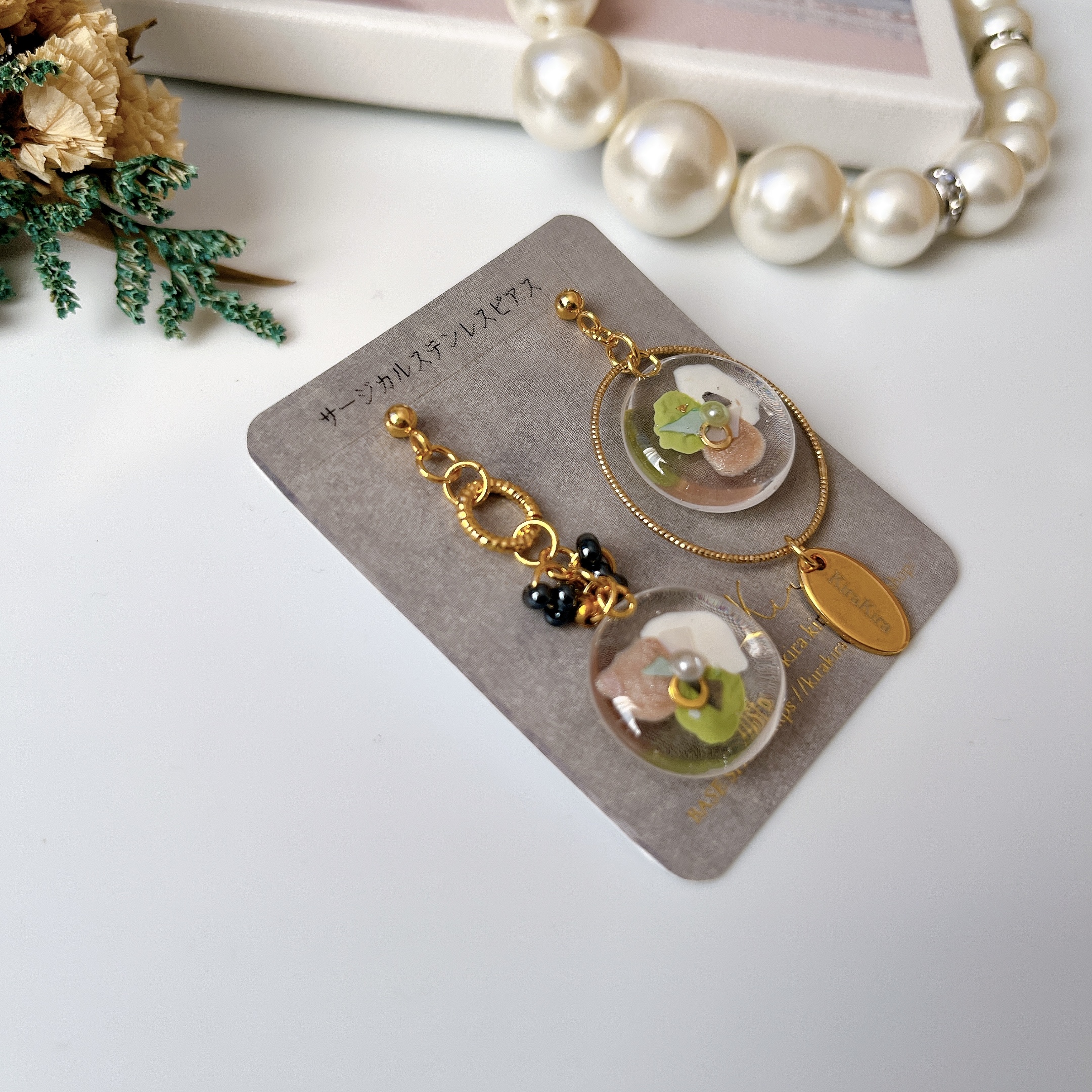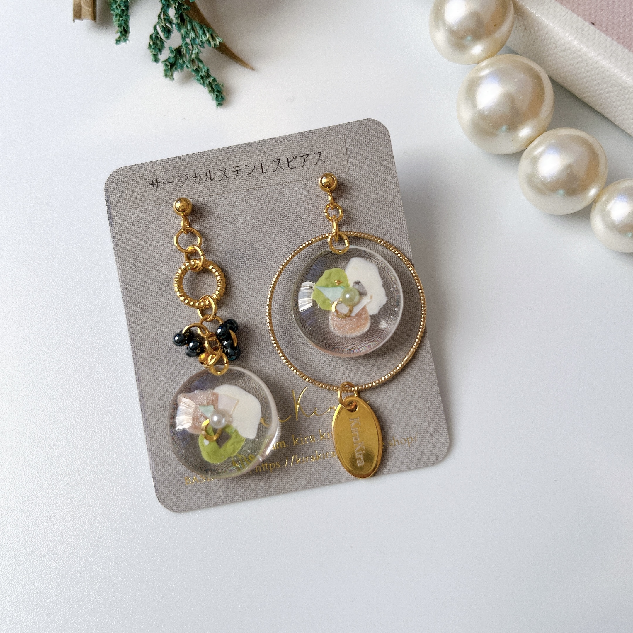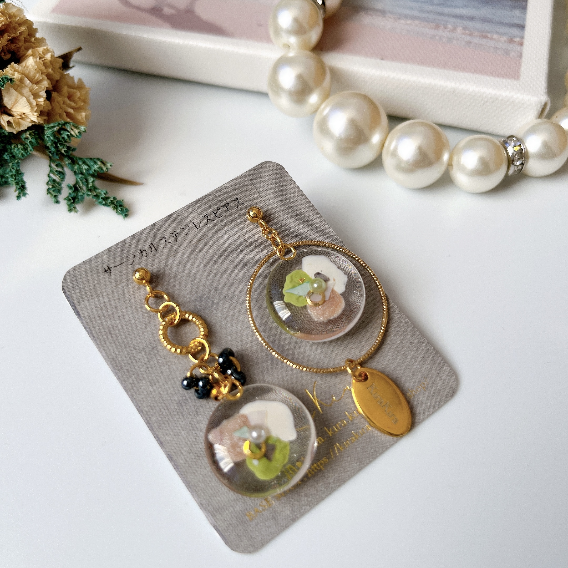 クリアベースにホワイト、草色、ラメ入りベージュの3色カボションに紺色ビーズやプレートやフープを組み合わせたアシンメトリーのピアスです。
