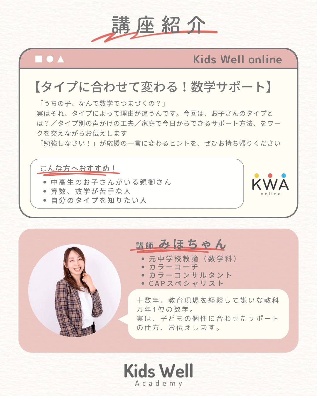 この講座では、数学・英語、そして心におけるタイプ別サポート法をお伝えします。