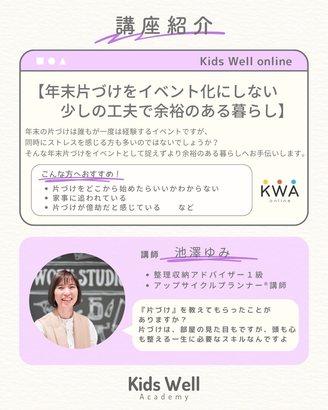 無理なく実践できる方法で“自分に合った片づけ方”が見つかる講座です。