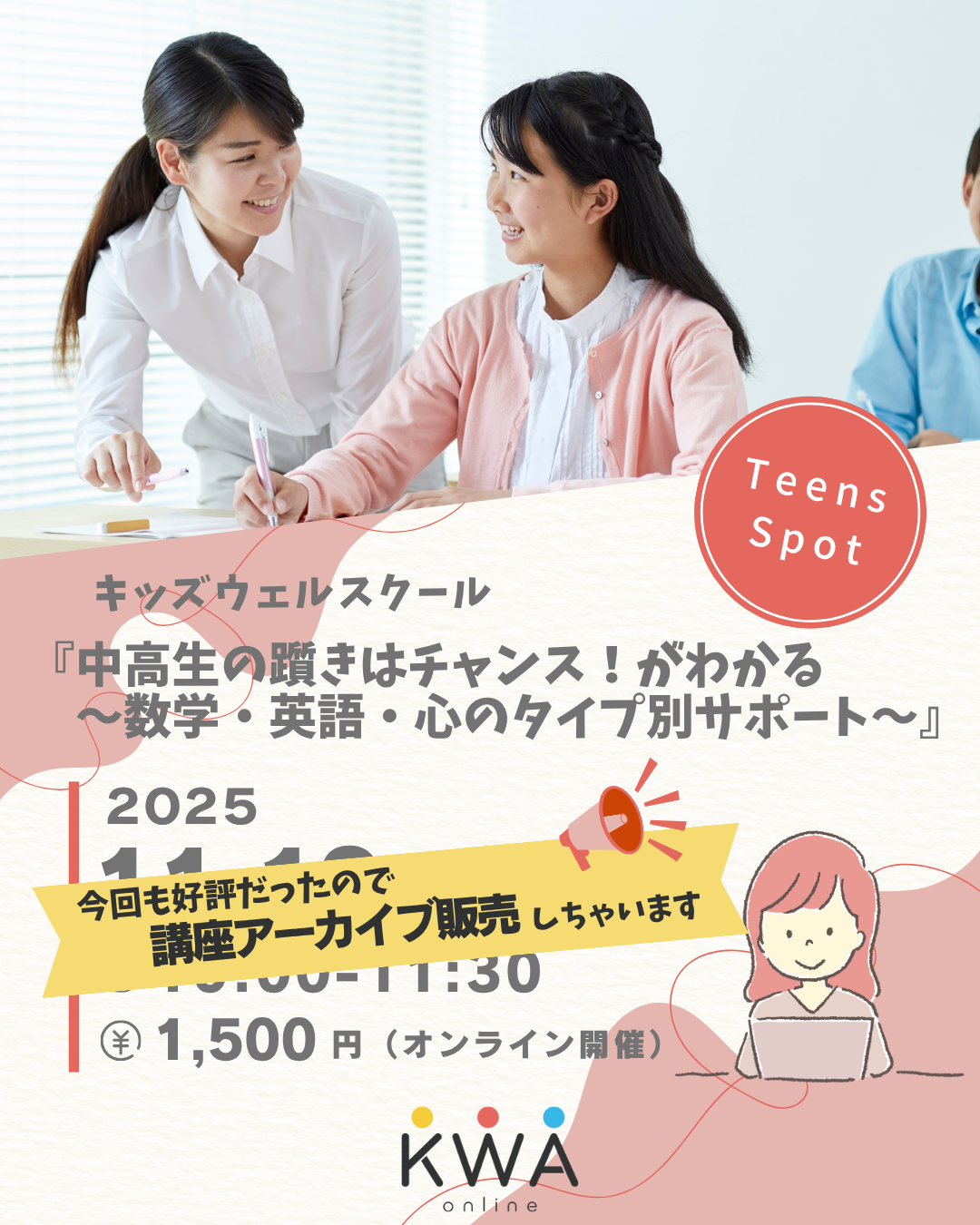 【アーカイブ販売】キッズウェルスクール✖️ティーンズスポット【中高生の躓き(つまずき)はチャンス!がわかる~数学・英語・心のタイプ別サポート~】