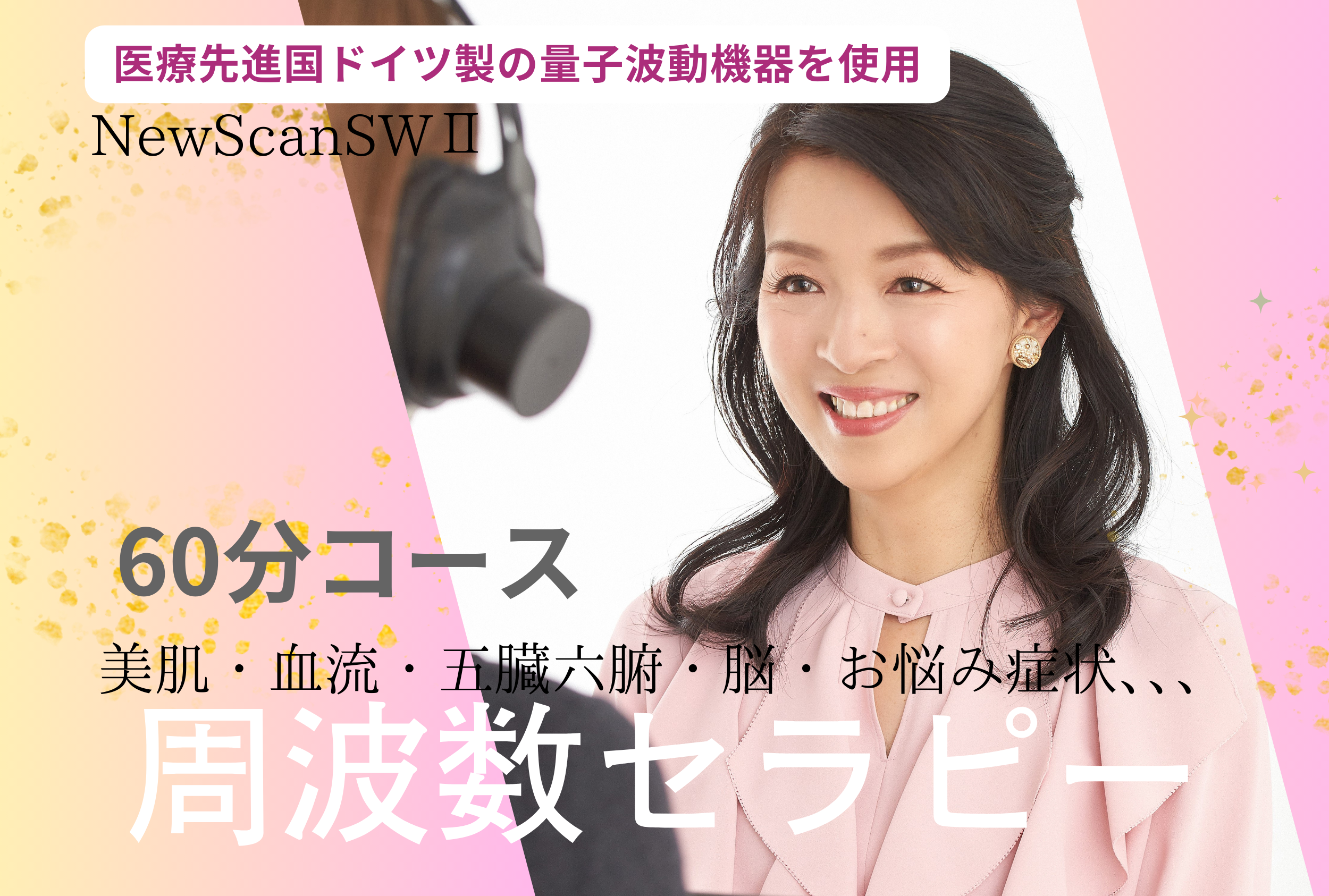 使用するドイツ製波動機器(NewScanSWⅢ)は、現在ドイツ国内の医療機関で実際に使用されているもの。ヘッドホンから身体にいい超低周波音を流し、体内の様子をスキャン。結果をパソコン画面に映し出した後、適切な健康周波数音を送ることで、ミクロの細胞レベルで心身の状態を整え、免疫の強化・細胞本来の状態に導きます。