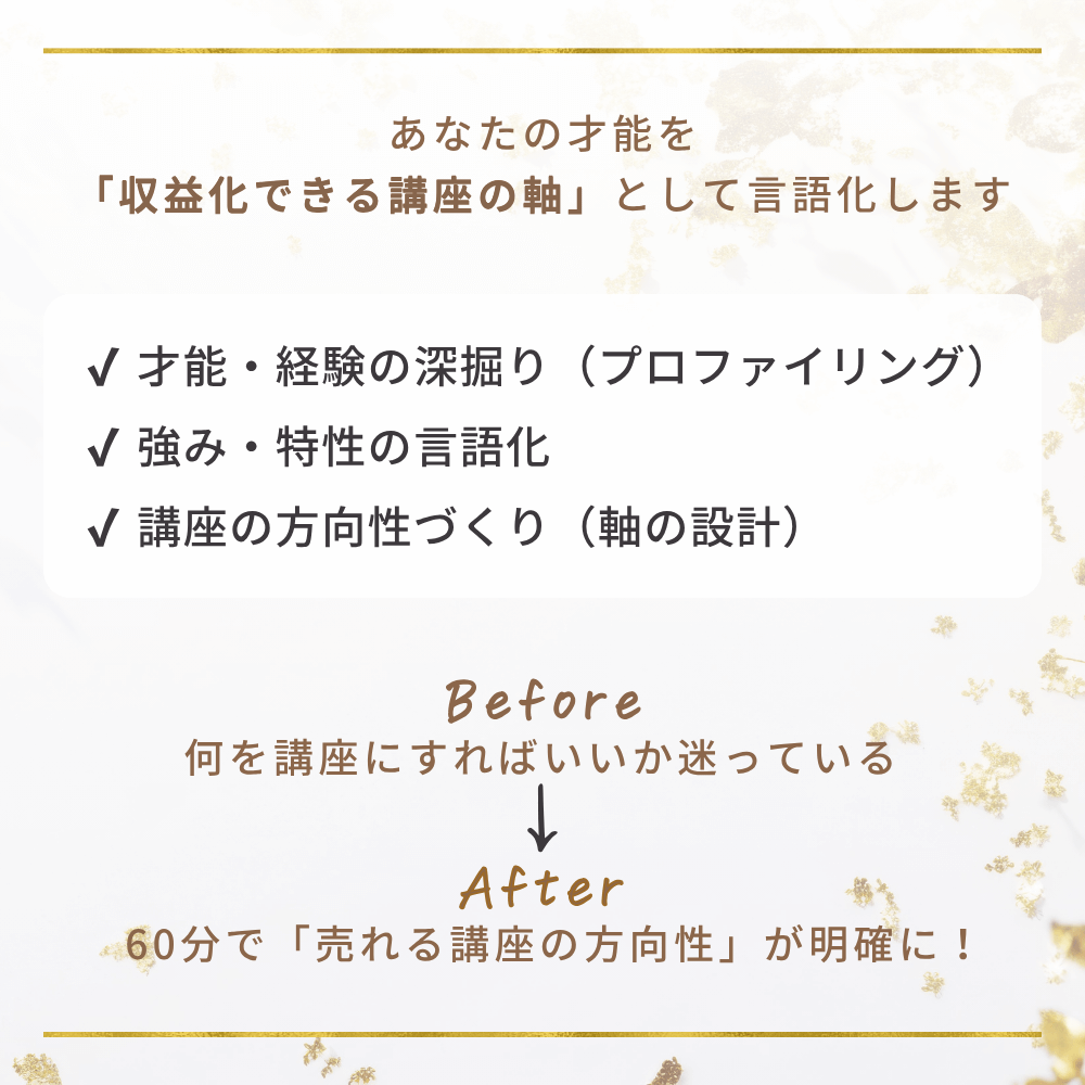 「本当に売れる講座の軸」を見つけ出す60分です。