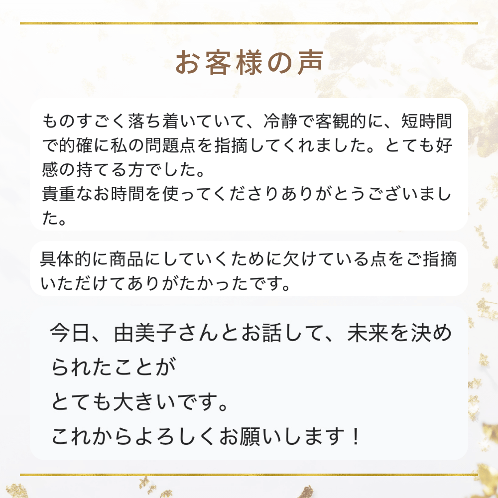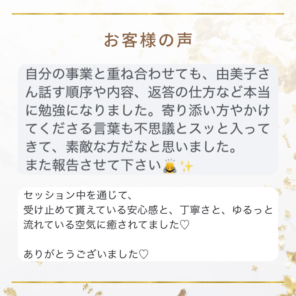 「思った以上に深く質問して下さり、自分も忘れてた考えや思考を思い出せたり、1人で抱えてモヤモヤしてた事をシンプルに明確に整理して下さったので、凄くスッキリしました」
