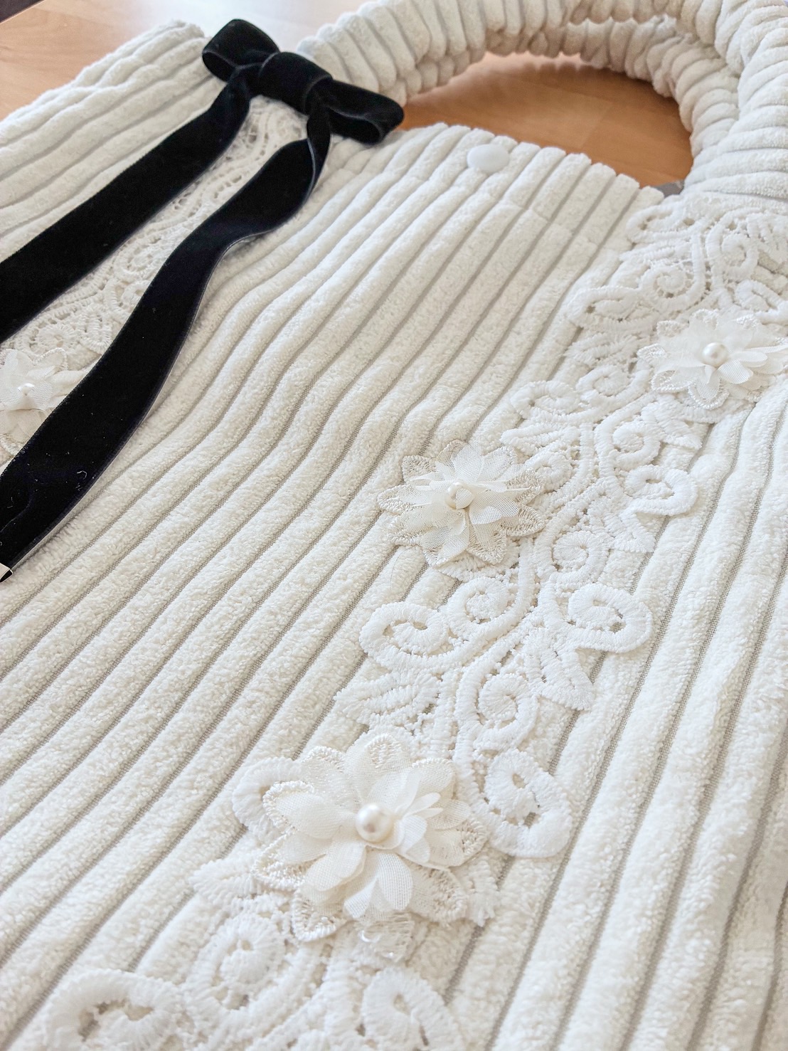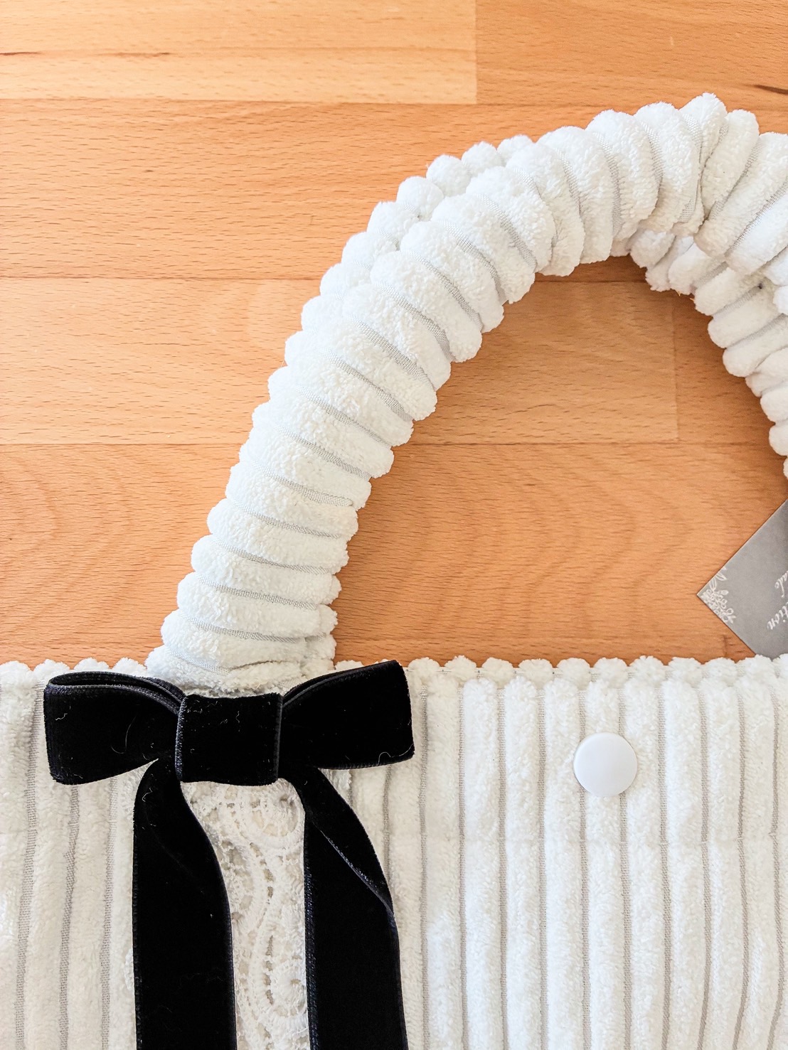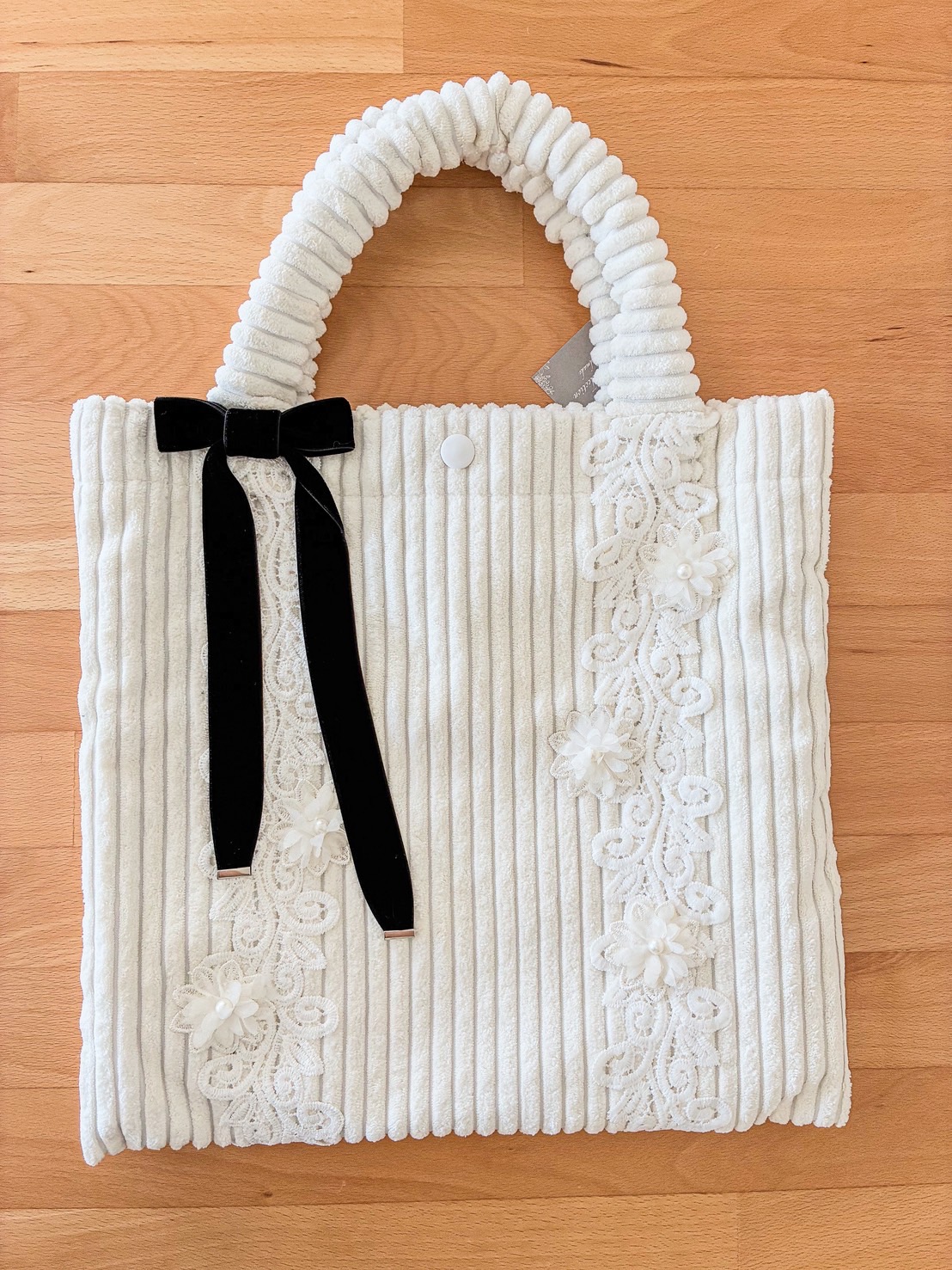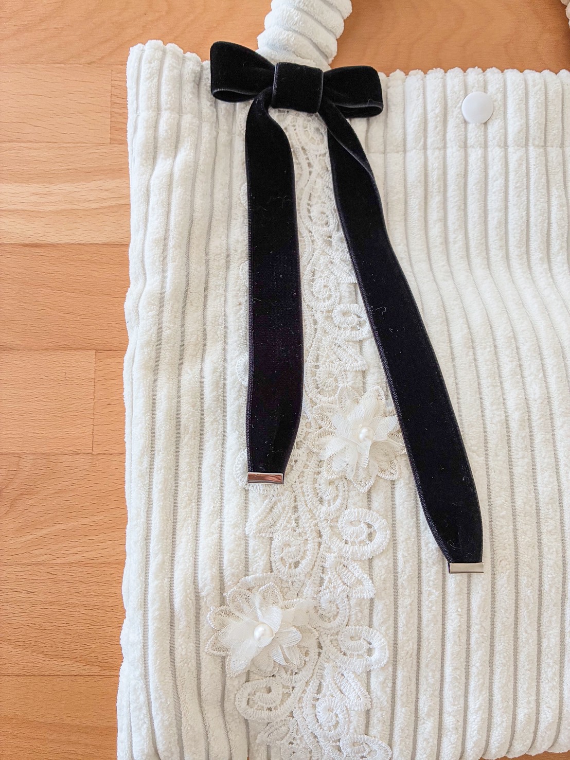 ベルベットの黒のリボンが、白のバックのスパイスとなり、大人可愛いデザインです。