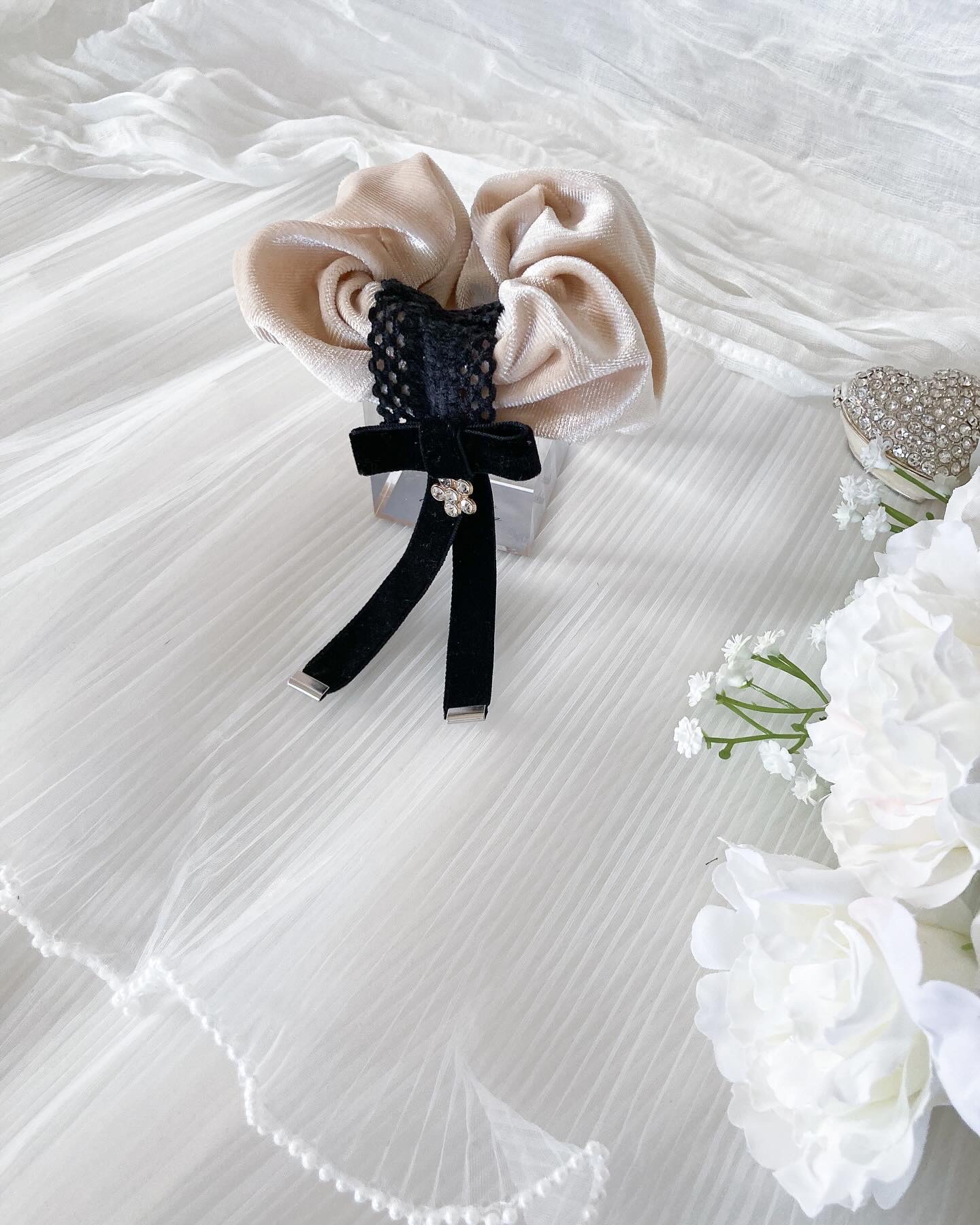 ベルベット素材のシュシュの肌触りがとても気持ちよく、それに合わせ、アクセントのリボンもベルベットにし