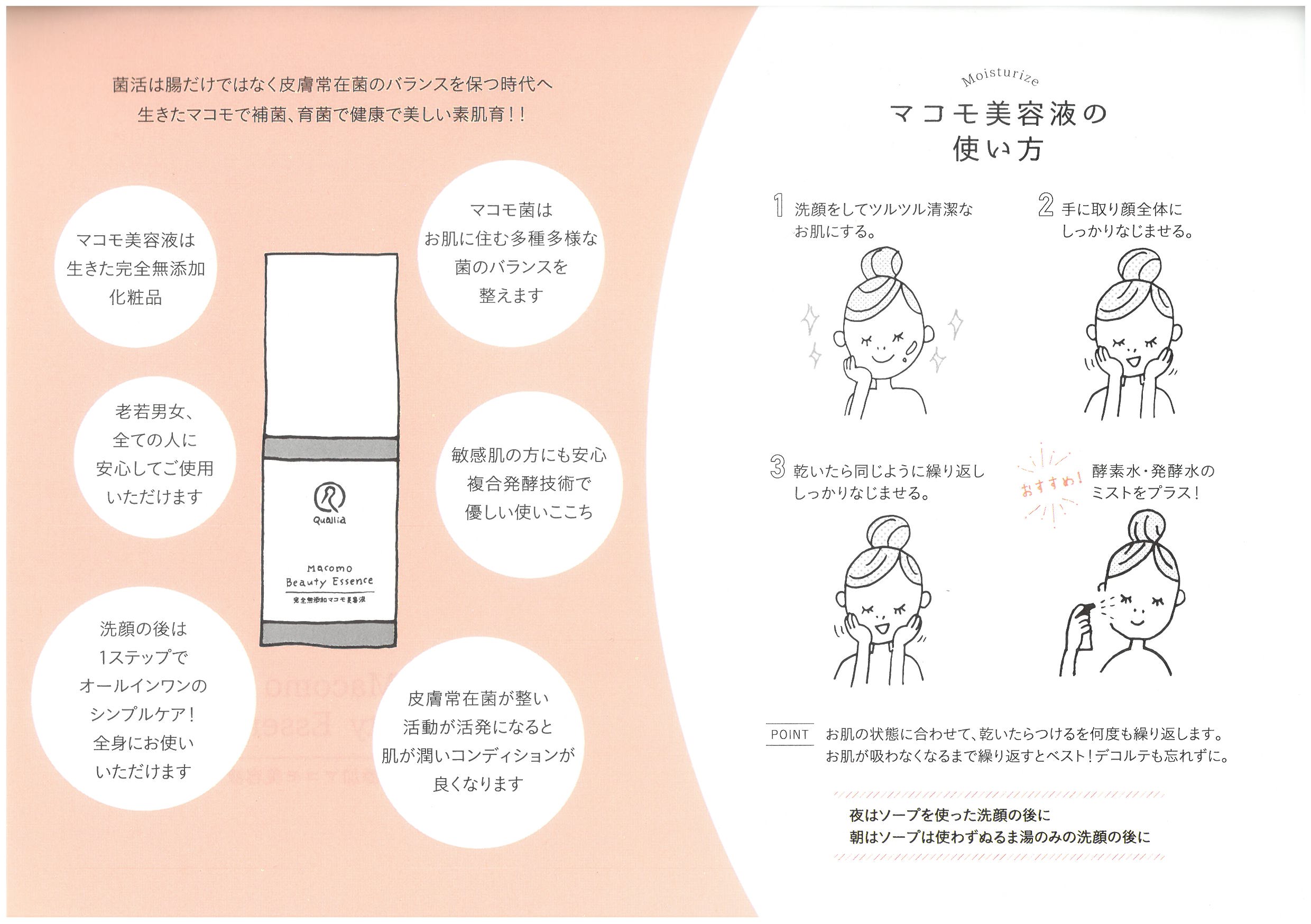翌朝は菌達による生産物質が生かされるよう、ぬるま湯のみで洗顔し、マコモ美容液をご使用ください。