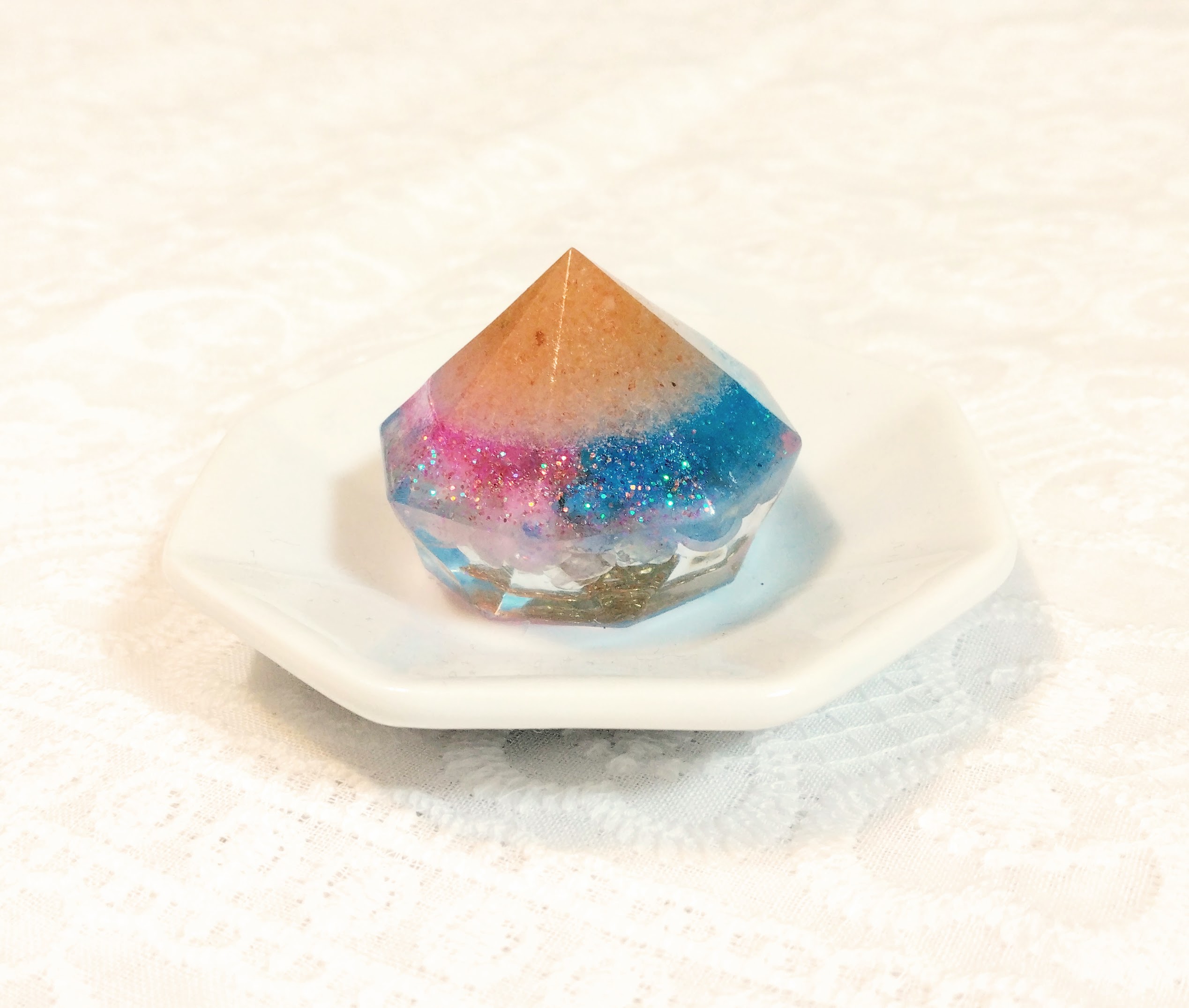 こちらは、2種類のクリスタルを使用し、その色に合わせて調和のエネルギーを表現した盛り塩クリスタルです。