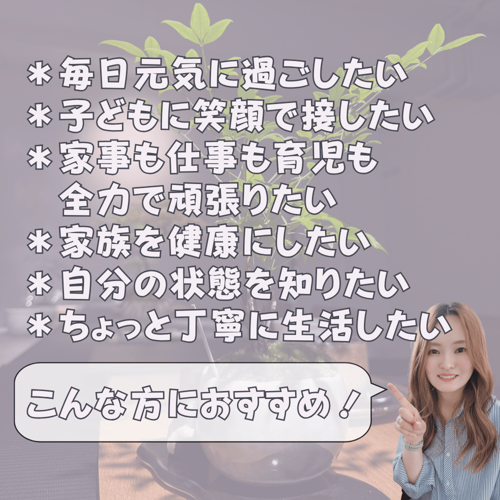家族の健康を支えるために、まず自分を整えたいと思っている方