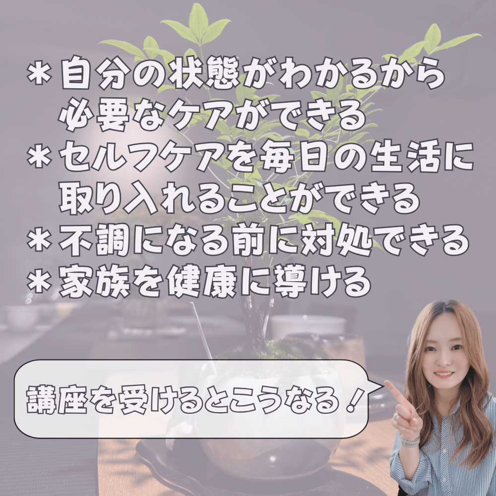 季節や体調に合わせたセルフケア法(食・睡眠・心の整え方)が身につきます。