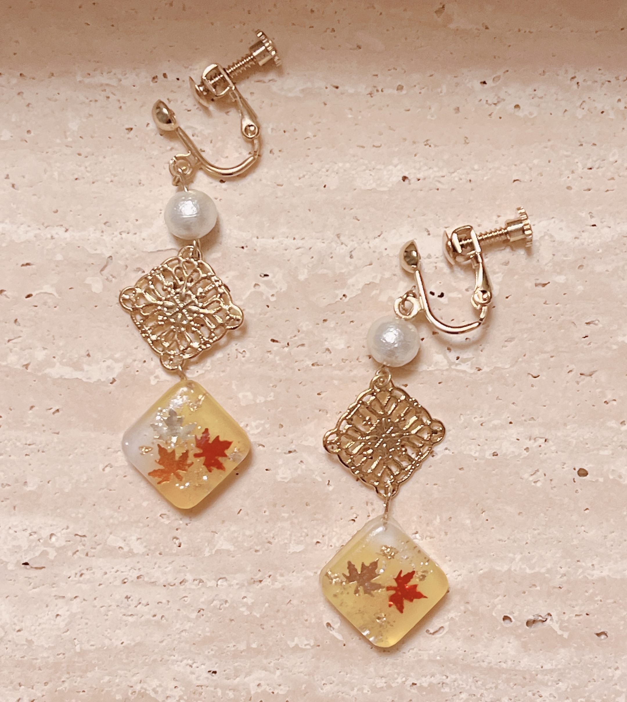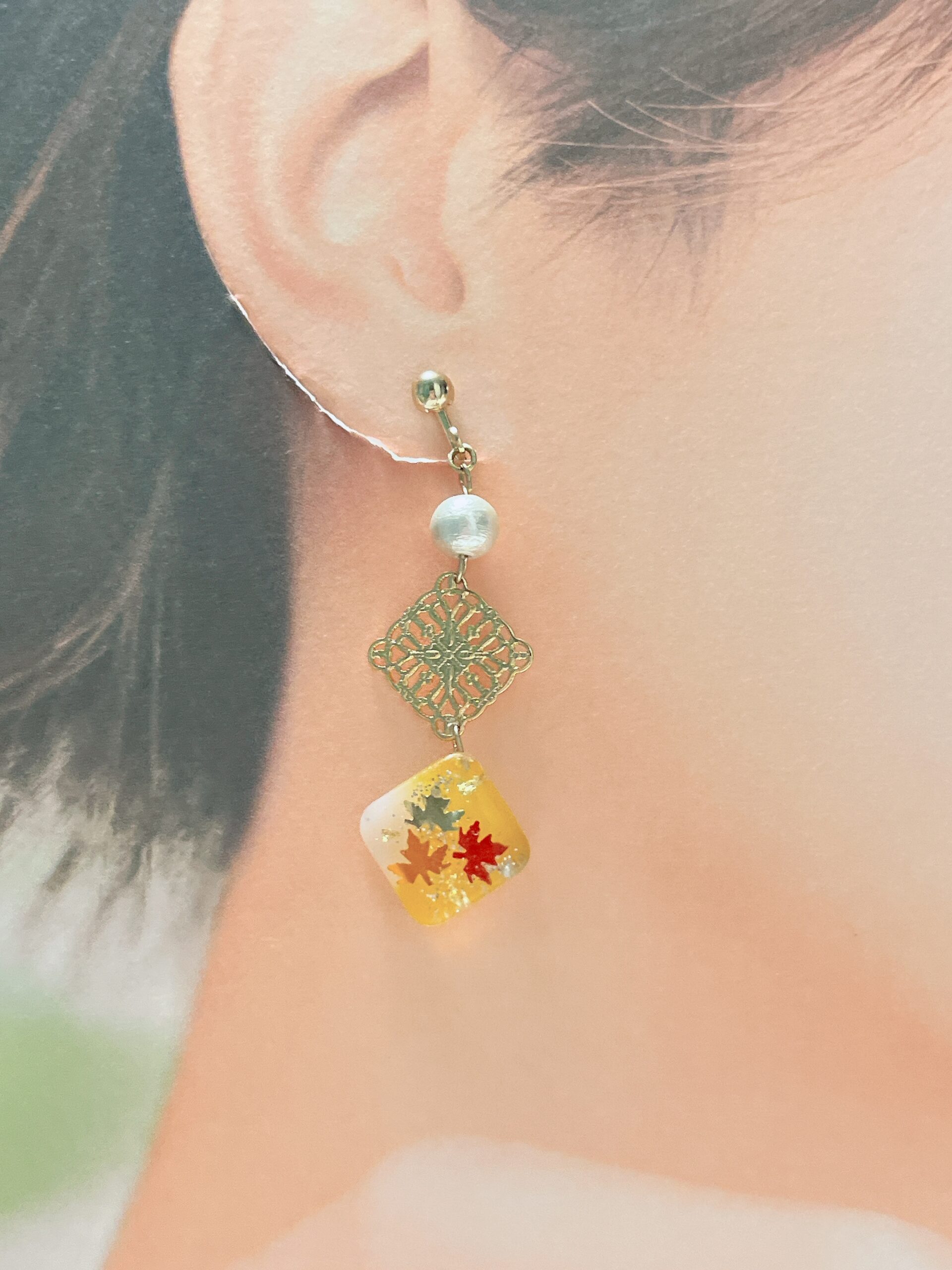 紅葉パーツ、金箔、銀ラメのラインを閉じ込めております。