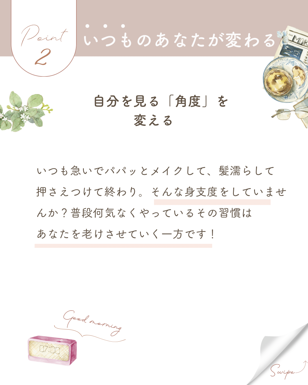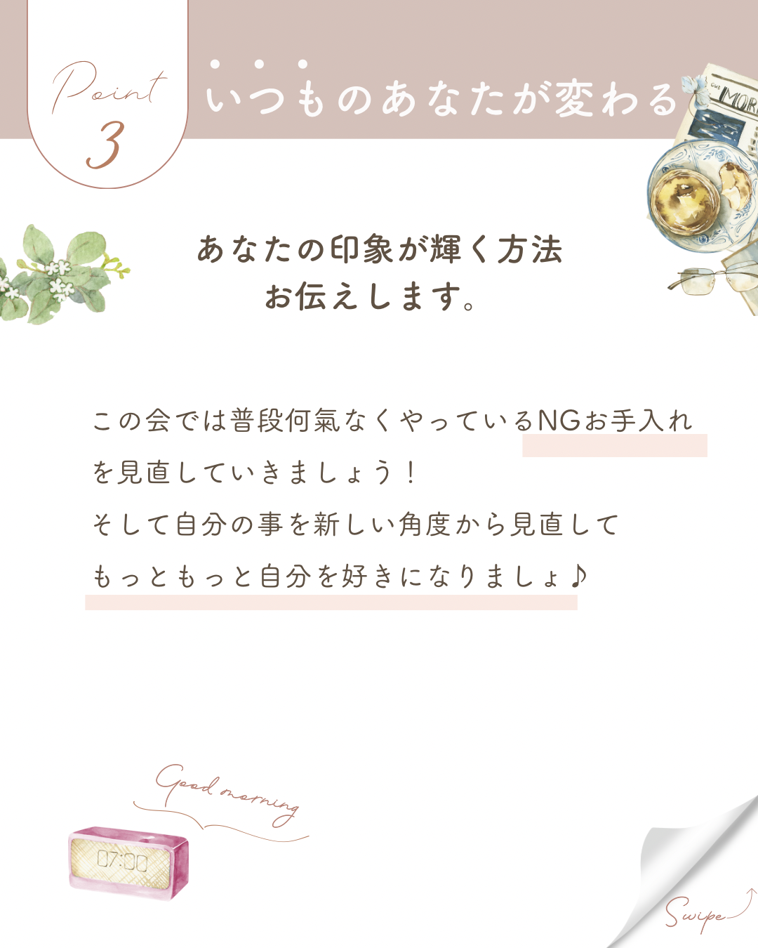 相談会ですので特にご用意するものはありませんが、普段からお使いのヘアケア、メイクアップ用品についてお悩みのある方はご用意ください。