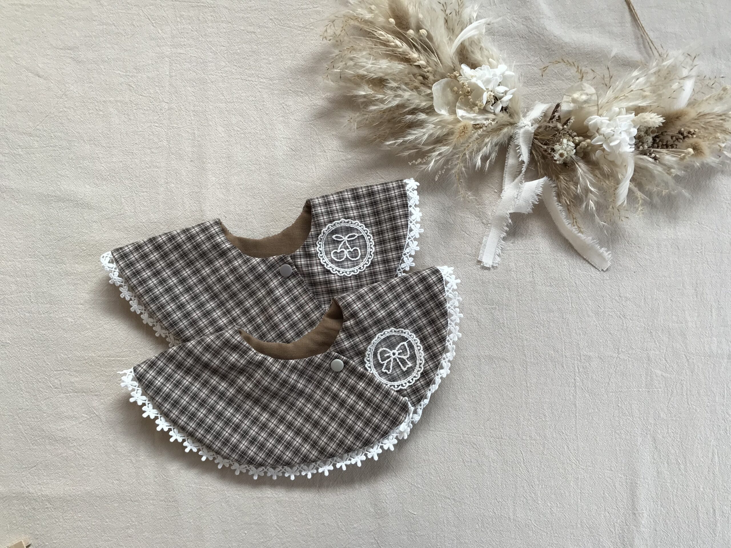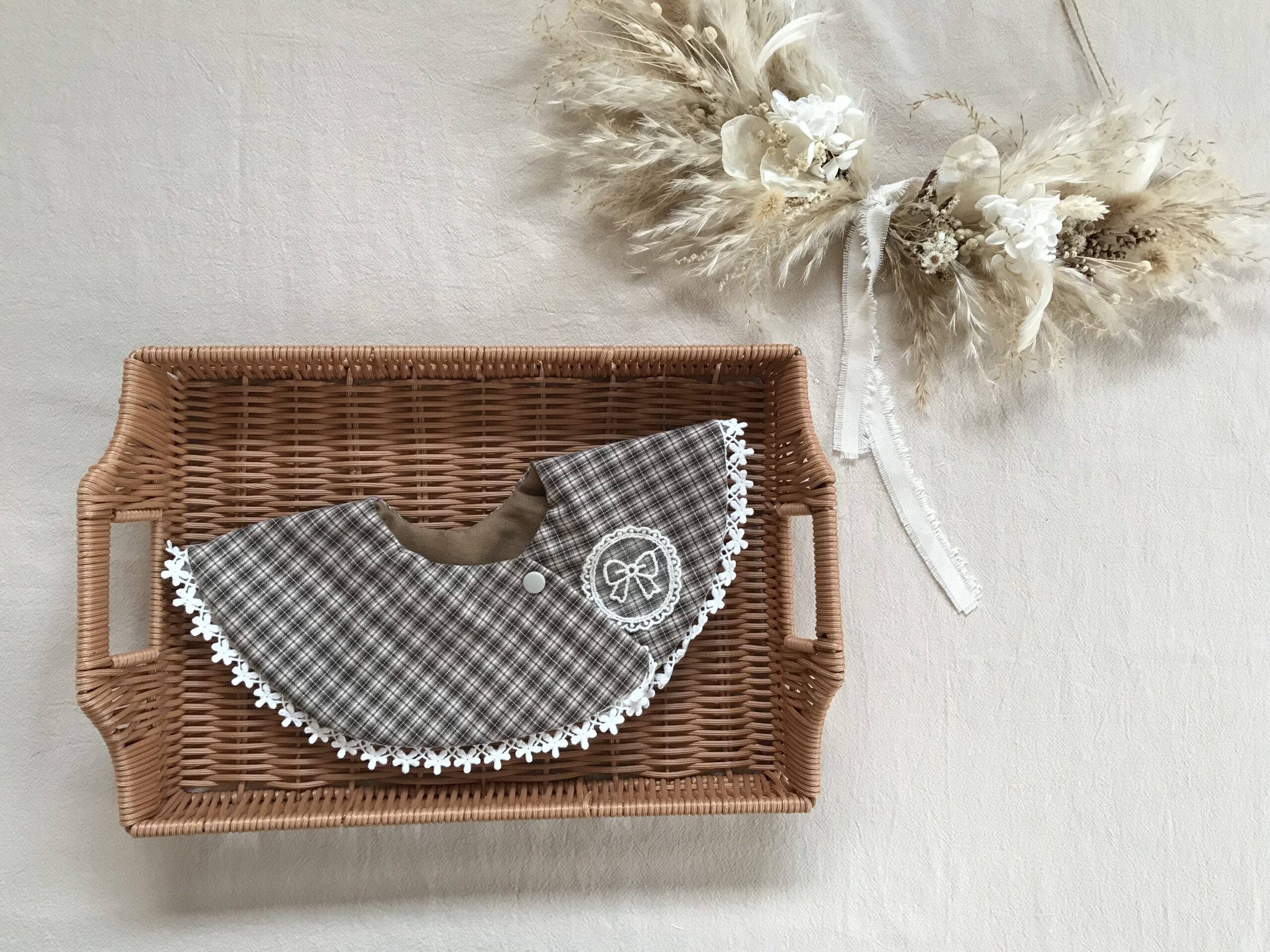 チェック柄のまんまるスタイに花柄の刺繍リボンが360°周りについていて