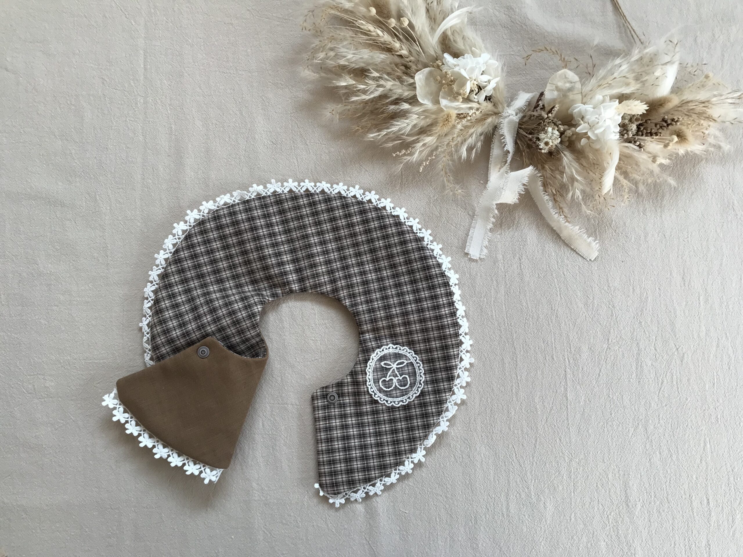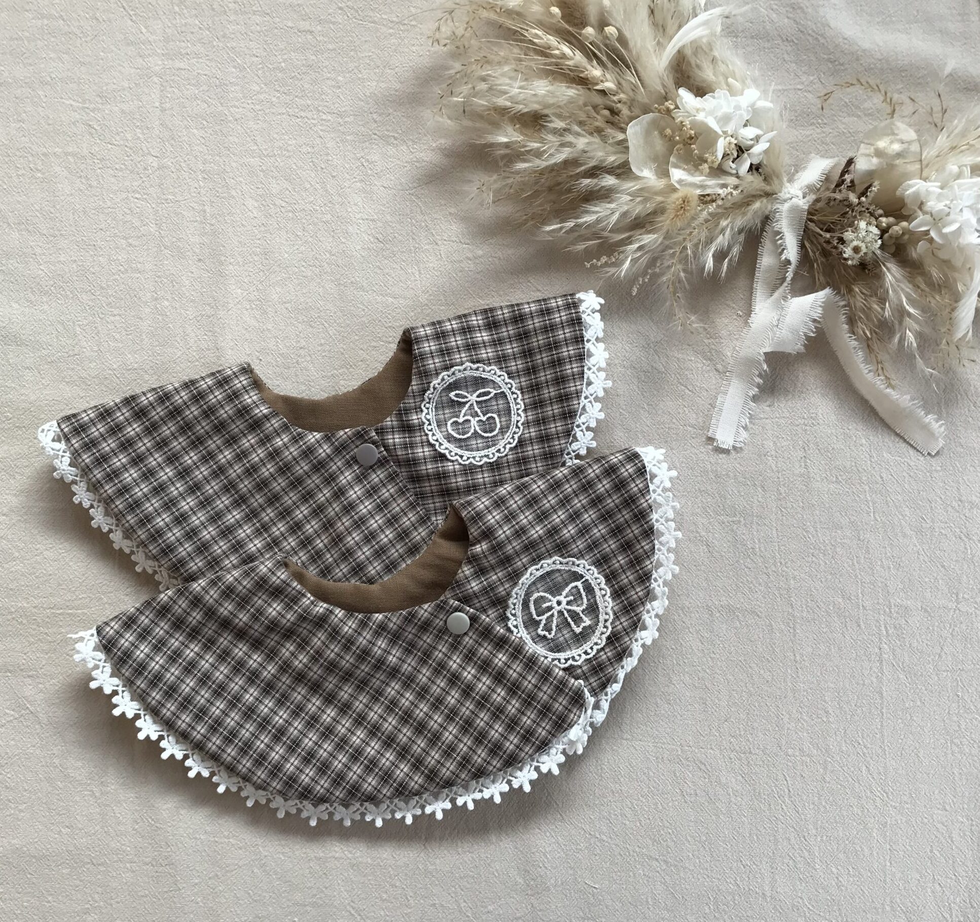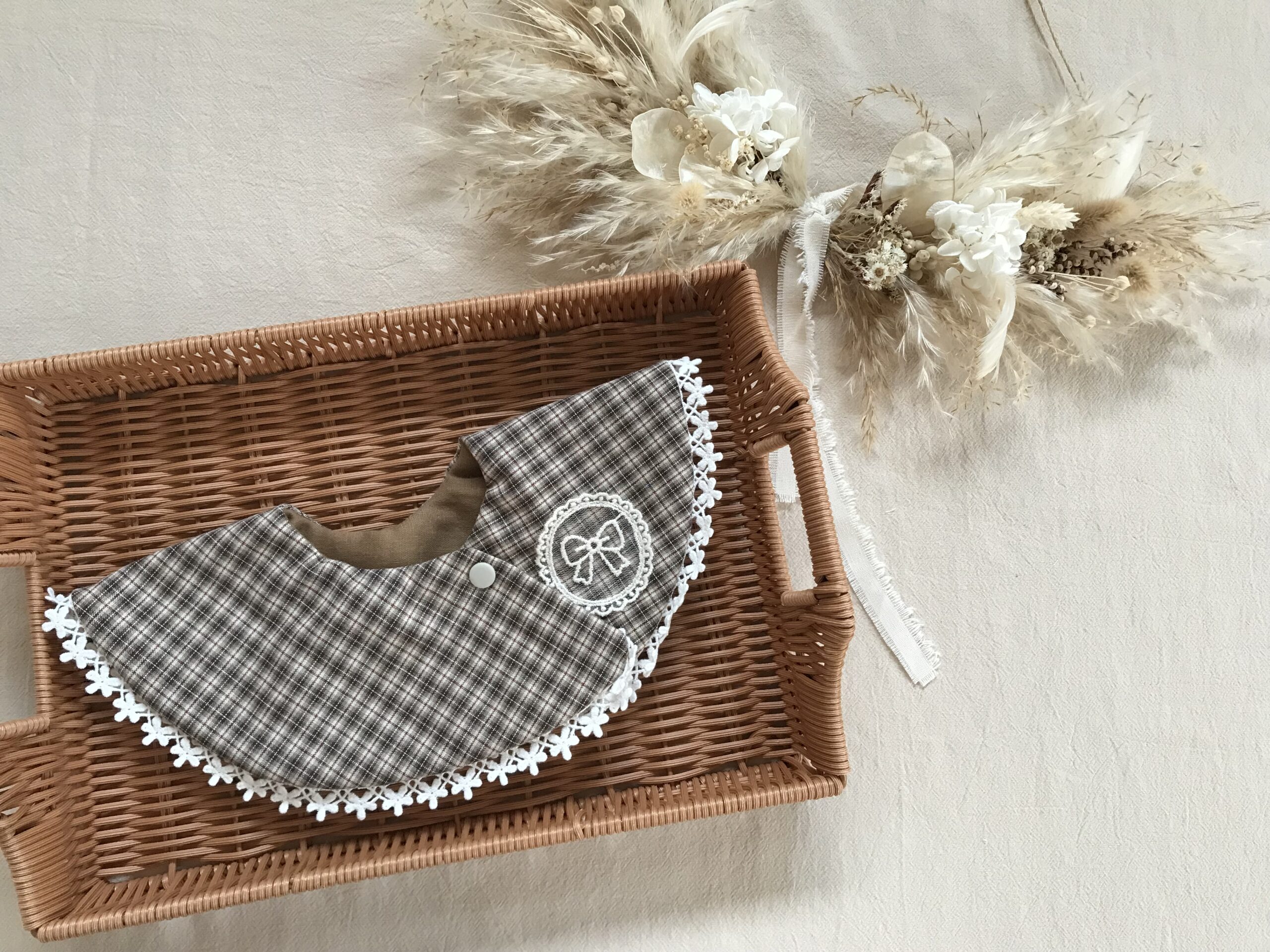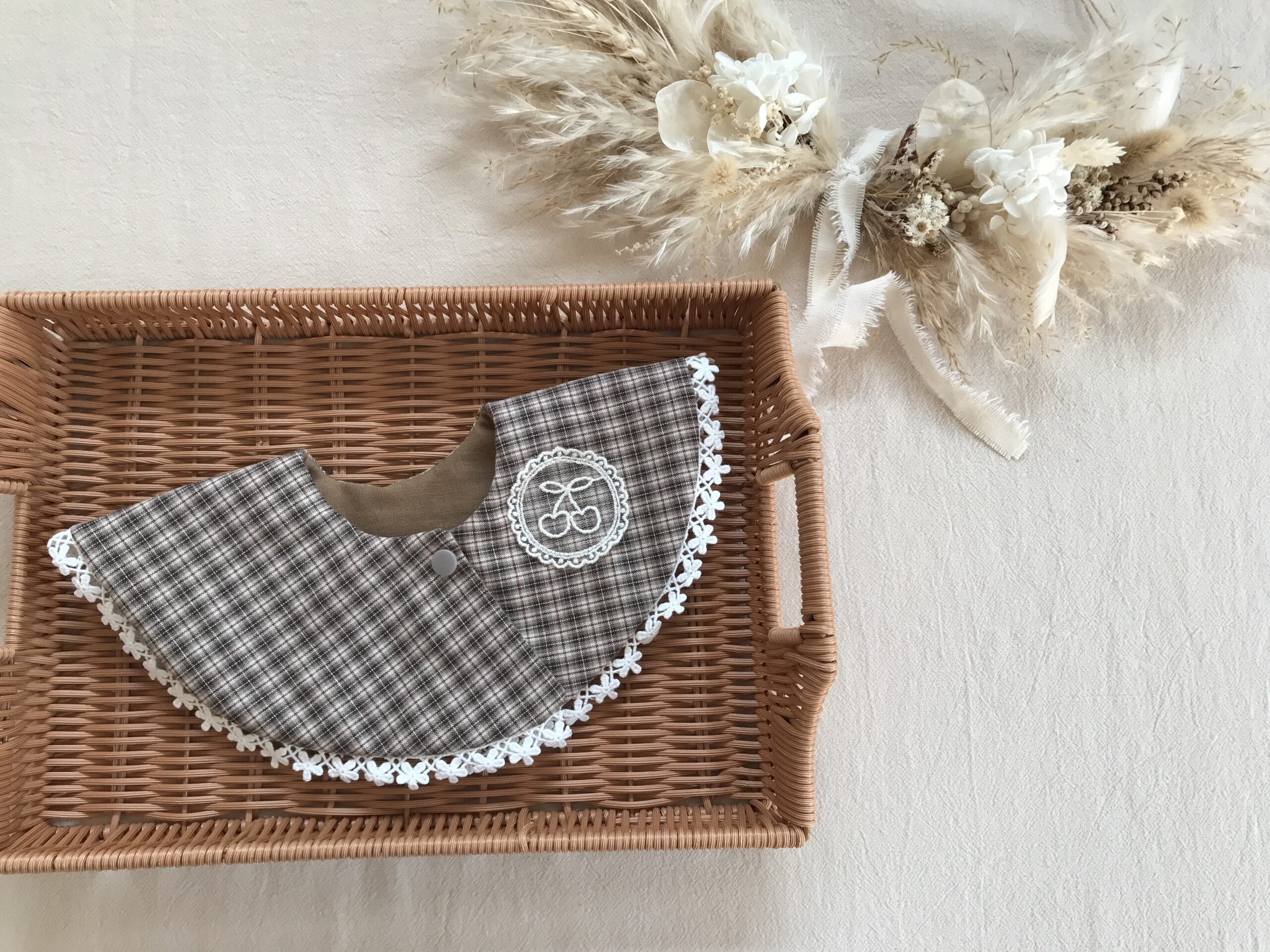 チェック柄に可愛い刺繍がワンポイントになっています🌼