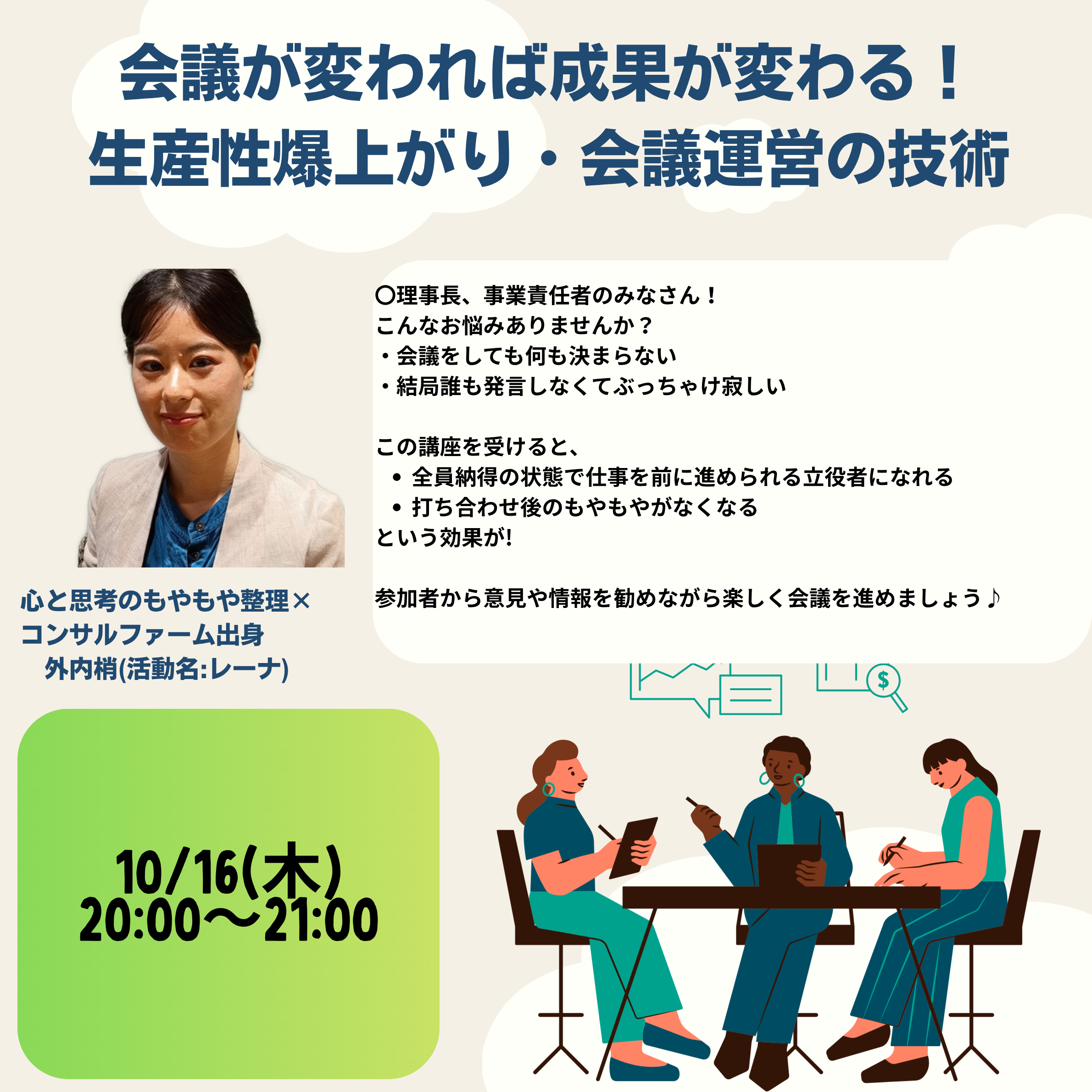 会議が変われば仕事の成果が変わる!コンサルファーム経験者が伝授する生産性爆上がり・会議運営の技術【10/16(火)21時~22時】