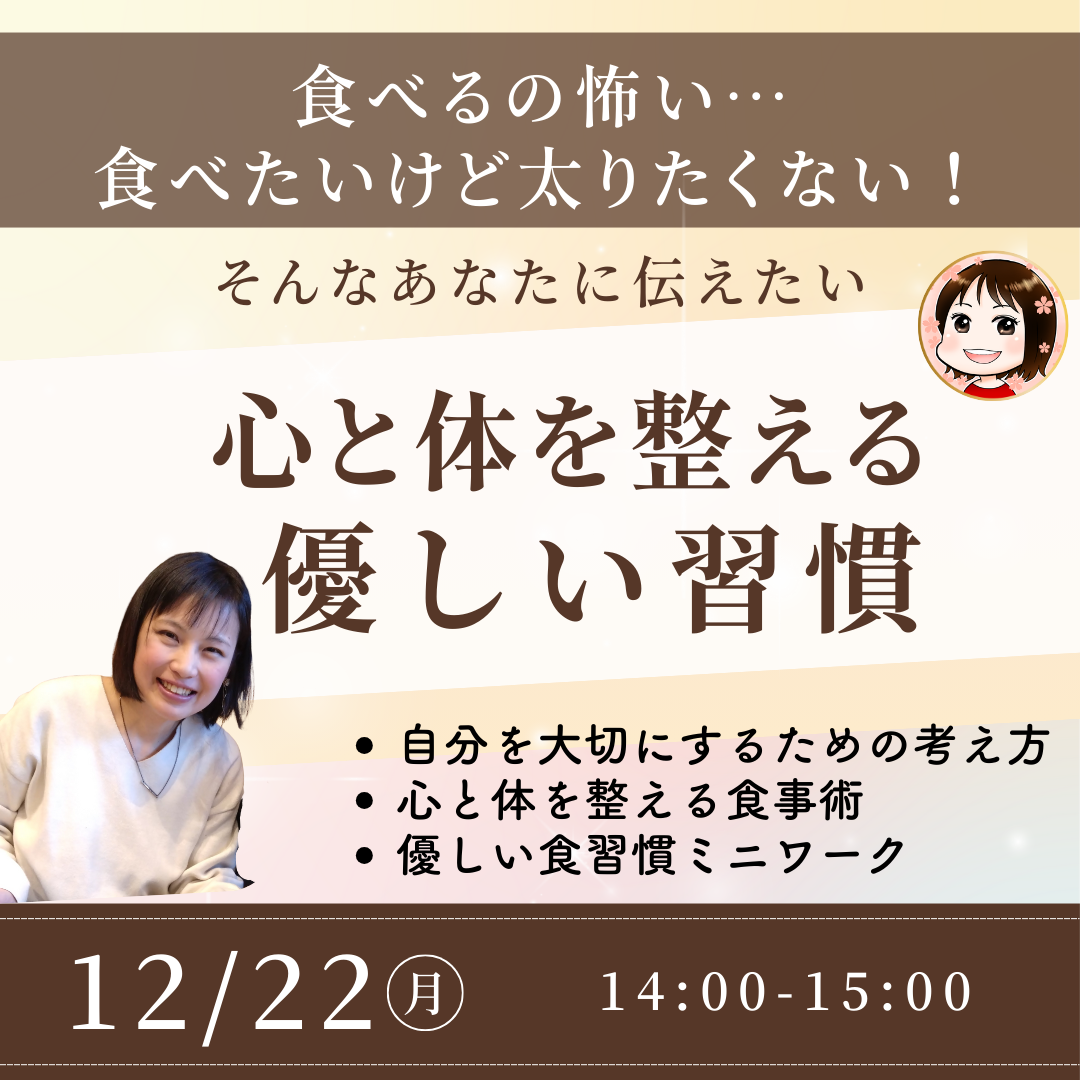 食べたいけど太りたくない!そんなあなたに伝える”心と体を整える優しい習慣”【12月22日(月) 14時~15時)】